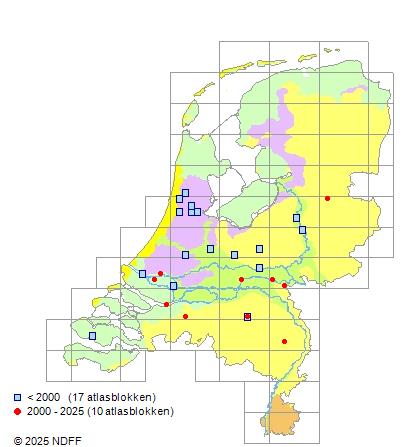 Het aantal atlasblokken (5x5 km) waarin de soort is gemeld binnen een periode van vijf jaar (vanaf 1980) of twintig jaar. Niet gecorrigeerd voor waarnemersinspanning en het aantal doorgegeven waarnemingen kan sterk variëren per periode, dus een trend in verspreiding kan hier niet direct uit worden afgelezen. Het opgegeven jaartal is het eerste jaar van de periode. Bron: gevalideerde waarnemingen uit de NDFF.
