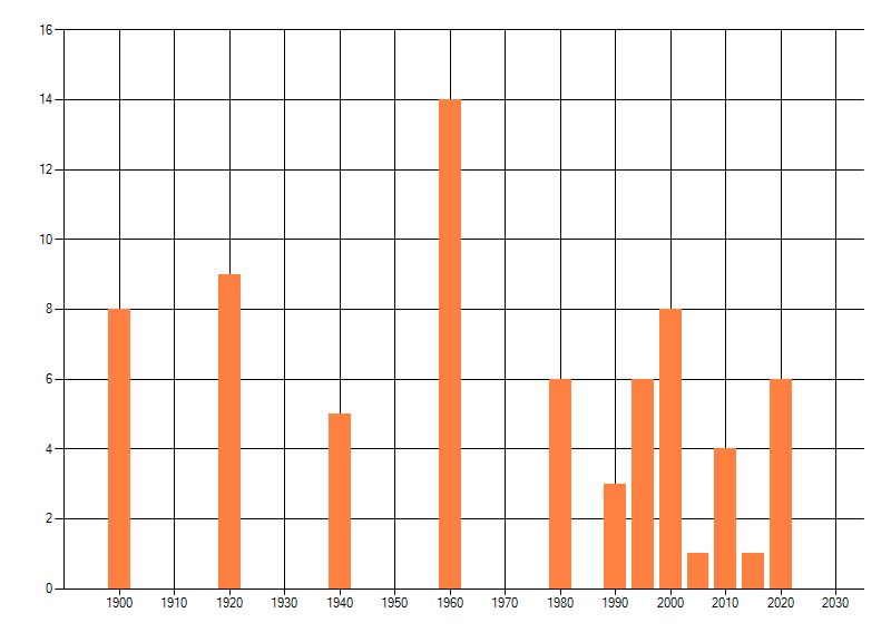Het aantal atlasblokken (5x5 km) waarin de soort is gemeld binnen een periode van vijf jaar (vanaf 1980) of twintig jaar. Niet gecorrigeerd voor waarnemersinspanning en het aantal doorgegeven waarnemingen kan sterk variëren per periode, dus een trend in verspreiding kan hier niet direct uit worden afgelezen. Het opgegeven jaartal is het eerste jaar van de periode. Bron: gevalideerde waarnemingen uit de NDFF.