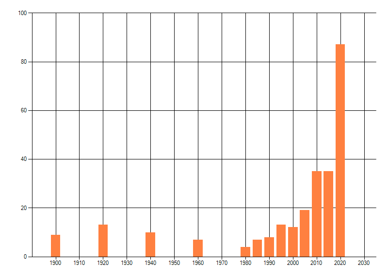 Het aantal atlasblokken (5x5 km) waarin de soort is gemeld binnen een periode van vijf jaar (vanaf 1980) of twintig jaar. Niet gecorrigeerd voor waarnemersinspanning en het aantal doorgegeven waarnemingen kan sterk variëren per periode, dus een trend in verspreiding kan hier niet direct uit worden afgelezen. Het opgegeven jaartal is het eerste jaar van de periode. Bron: gevalideerde waarnemingen uit de NDFF.