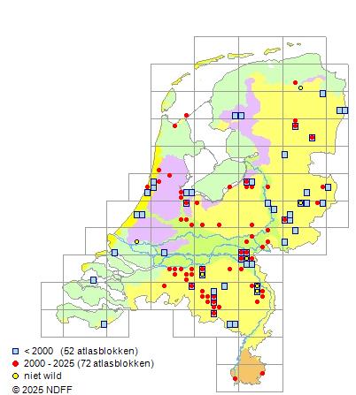 Het aantal atlasblokken (5x5 km) waarin de soort is gemeld binnen een periode van vijf jaar (vanaf 1980) of twintig jaar. Niet gecorrigeerd voor waarnemersinspanning en het aantal doorgegeven waarnemingen kan sterk variëren per periode, dus een trend in verspreiding kan hier niet direct uit worden afgelezen. Het opgegeven jaartal is het eerste jaar van de periode. Bron: gevalideerde waarnemingen uit de NDFF.