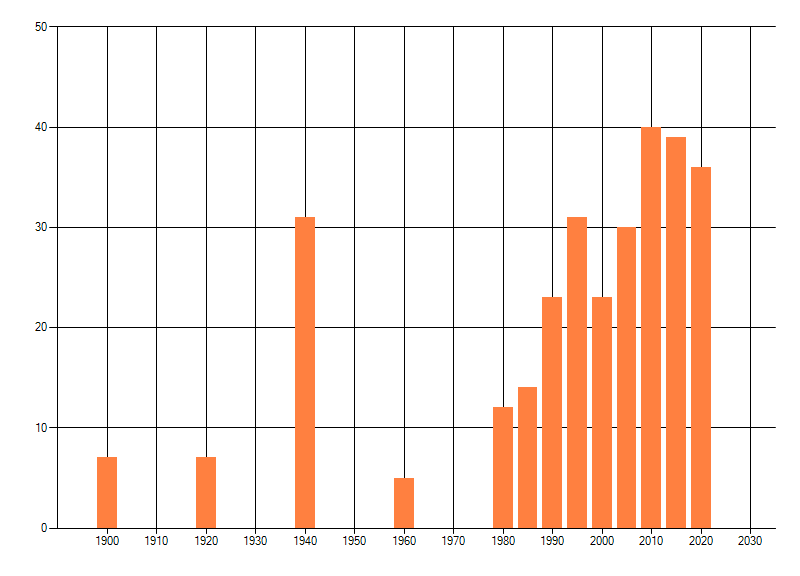 Het aantal atlasblokken (5x5 km) waarin de soort is gemeld binnen een periode van vijf jaar (vanaf 1980) of twintig jaar. Niet gecorrigeerd voor waarnemersinspanning en het aantal doorgegeven waarnemingen kan sterk variëren per periode, dus een trend in verspreiding kan hier niet direct uit worden afgelezen. Het opgegeven jaartal is het eerste jaar van de periode. Bron: gevalideerde waarnemingen uit de NDFF.