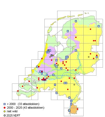 Het aantal atlasblokken (5x5 km) waarin de soort is gemeld binnen een periode van vijf jaar (vanaf 1980) of twintig jaar. Niet gecorrigeerd voor waarnemersinspanning en het aantal doorgegeven waarnemingen kan sterk variëren per periode, dus een trend in verspreiding kan hier niet direct uit worden afgelezen. Het opgegeven jaartal is het eerste jaar van de periode. Bron: gevalideerde waarnemingen uit de NDFF.