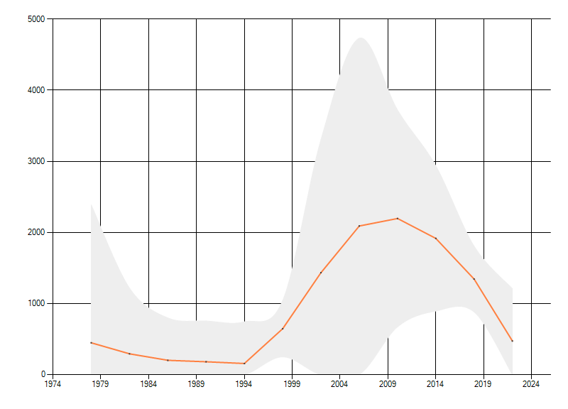 Gemiddelde trend van het aantal kilometerhokken waarin de soort voorkomt, weergegeven als indexcijfer (1975-1978 = 100).