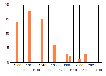 Het aantal atlasblokken (5x5 km) waarin de soort is gemeld binnen een periode van vijf jaar (vanaf 1980) of twintig jaar. Niet gecorrigeerd voor waarnemersinspanning en het aantal doorgegeven waarnemingen kan sterk variëren per periode, dus een trend in verspreiding kan hier niet direct uit worden afgelezen. Het opgegeven jaartal is het eerste jaar van de periode. Bron: gevalideerde waarnemingen uit de NDFF.
