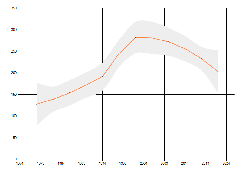 Gemiddelde trend van het aantal kilometerhokken waarin de soort voorkomt, weergegeven als indexcijfer (1975-1978 = 100).