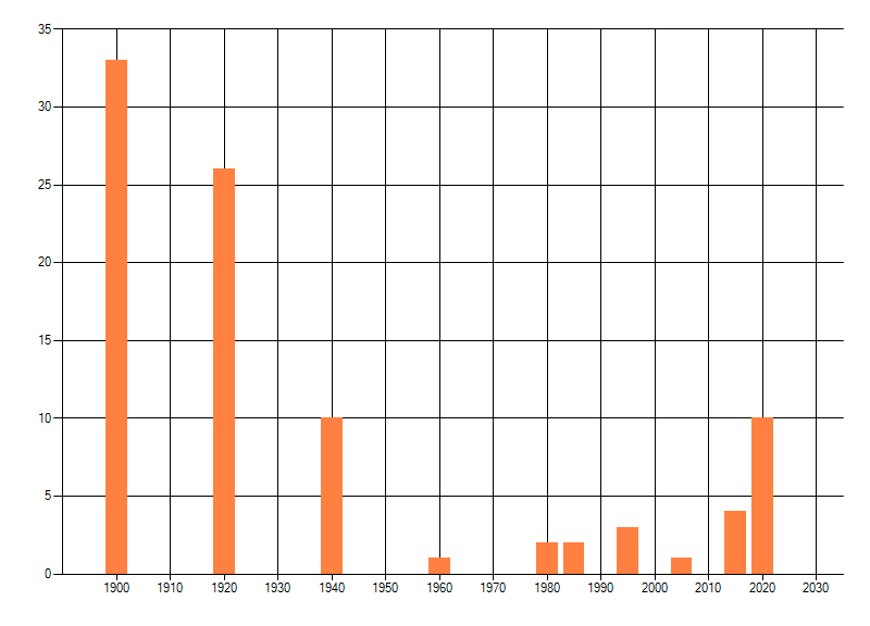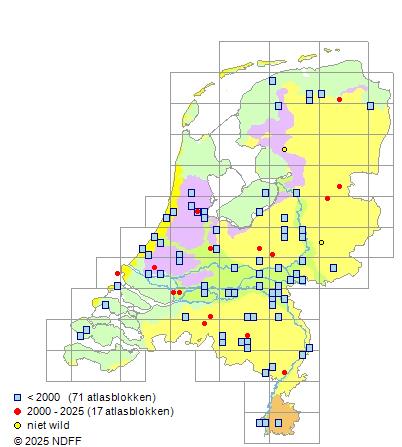 Het aantal atlasblokken (5x5 km) waarin de soort is gemeld binnen een periode van vijf jaar (vanaf 1980) of twintig jaar. Niet gecorrigeerd voor waarnemersinspanning en het aantal doorgegeven waarnemingen kan sterk variëren per periode, dus een trend in verspreiding kan hier niet direct uit worden afgelezen. Het opgegeven jaartal is het eerste jaar van de periode. Bron: gevalideerde waarnemingen uit de NDFF.