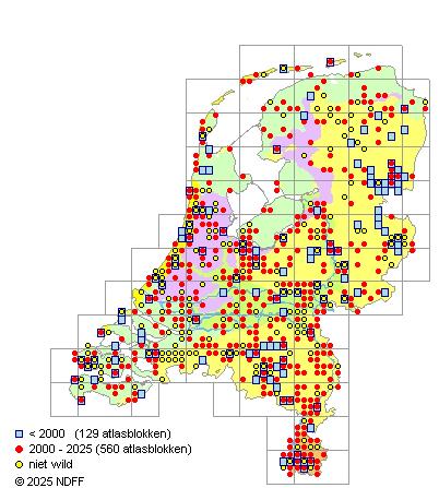Het aantal atlasblokken (5x5 km) waarin de soort is gemeld binnen een periode van vijf jaar (vanaf 1980) of twintig jaar. Niet gecorrigeerd voor waarnemersinspanning en het aantal doorgegeven waarnemingen kan sterk variƫren per periode, dus een trend in verspreiding kan hier niet direct uit worden afgelezen. Het opgegeven jaartal is het eerste jaar van de periode. Bron: gevalideerde waarnemingen uit de NDFF.
