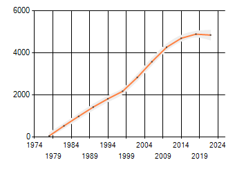 Gemiddelde trend van het aantal kilometerhokken waarin de soort voorkomt, weergegeven als indexcijfer (1975-1978 = 100). De trend is gecorrigeerd voor waarnemersinspanning en geeft de relatieve verandering in het aantal bezette kilometerhokken weer. Voor de berekening worden de data per periode van vier jaar samengenomen. In de grafiek correspondeert ieder punt met het laatste jaar van zo'n periode.