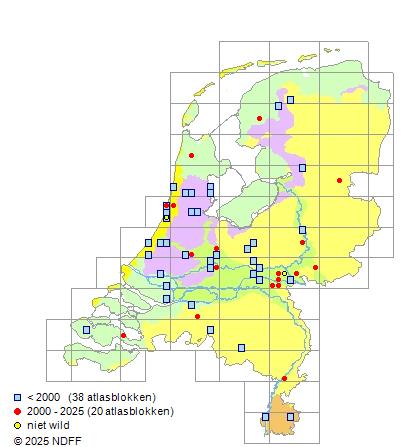 Het aantal atlasblokken (5x5 km) waarin de soort is gemeld binnen een periode van vijf jaar (vanaf 1980) of twintig jaar. Niet gecorrigeerd voor waarnemersinspanning en het aantal doorgegeven waarnemingen kan sterk variëren per periode, dus een trend in verspreiding kan hier niet direct uit worden afgelezen. Het opgegeven jaartal is het eerste jaar van de periode. Bron: gevalideerde waarnemingen uit de NDFF.