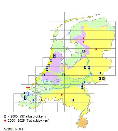 Het aantal atlasblokken (5x5 km) waarin de soort is gemeld binnen een periode van vijf jaar (vanaf 1980) of twintig jaar. Niet gecorrigeerd voor waarnemersinspanning en het aantal doorgegeven waarnemingen kan sterk variëren per periode, dus een trend in verspreiding kan hier niet direct uit worden afgelezen. Het opgegeven jaartal is het eerste jaar van de periode. Bron: gevalideerde waarnemingen uit de NDFF.