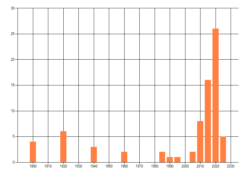 Het aantal atlasblokken (5x5 km) waarin de soort is gemeld binnen een periode van vijf jaar (vanaf 1980) of twintig jaar. Niet gecorrigeerd voor waarnemersinspanning en het aantal doorgegeven waarnemingen kan sterk variëren per periode, dus een trend in verspreiding kan hier niet direct uit worden afgelezen. Het opgegeven jaartal is het eerste jaar van de periode. Bron: gevalideerde waarnemingen uit de NDFF.