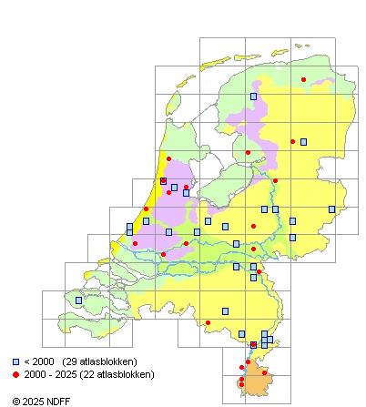 Het aantal atlasblokken (5x5 km) waarin de soort is gemeld binnen een periode van vijf jaar (vanaf 1980) of twintig jaar. Niet gecorrigeerd voor waarnemersinspanning en het aantal doorgegeven waarnemingen kan sterk variëren per periode, dus een trend in verspreiding kan hier niet direct uit worden afgelezen. Het opgegeven jaartal is het eerste jaar van de periode. Bron: gevalideerde waarnemingen uit de NDFF.
