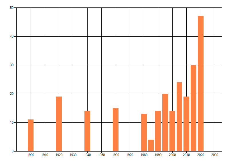 Het aantal atlasblokken (5x5 km) waarin de soort is gemeld binnen een periode van vijf jaar (vanaf 1980) of twintig jaar. Niet gecorrigeerd voor waarnemersinspanning en het aantal doorgegeven waarnemingen kan sterk variëren per periode, dus een trend in verspreiding kan hier niet direct uit worden afgelezen. Het opgegeven jaartal is het eerste jaar van de periode. Bron: gevalideerde waarnemingen uit de NDFF.