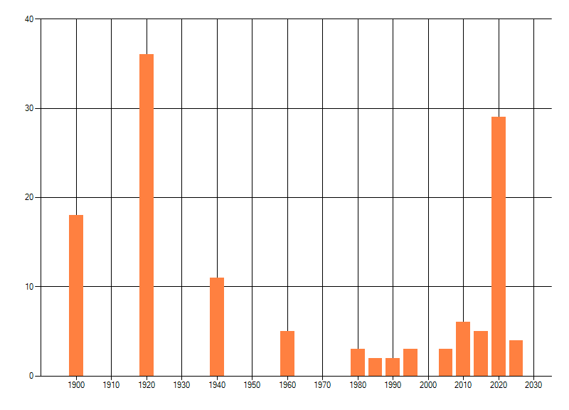 Het aantal atlasblokken (5x5 km) waarin de soort is gemeld binnen een periode van vijf jaar (vanaf 1980) of twintig jaar. Niet gecorrigeerd voor waarnemersinspanning en het aantal doorgegeven waarnemingen kan sterk variëren per periode, dus een trend in verspreiding kan hier niet direct uit worden afgelezen. Het opgegeven jaartal is het eerste jaar van de periode. Bron: gevalideerde waarnemingen uit de NDFF.