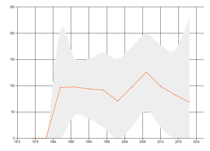Gemiddelde trend van het aantal kilometerhokken waarin de soort voorkomt, weergegeven als indexcijfer (1975-1978 = 100). De trend is gecorrigeerd voor waarnemersinspanning en geeft de relatieve verandering in het aantal bezette kilometerhokken weer. Voor de berekening worden de data per periode van vier jaar samengenomen. In de grafiek correspondeert ieder punt met het laatste jaar van zo'n periode.