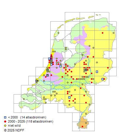 Het aantal atlasblokken (5x5 km) waarin de soort is gemeld binnen een periode van vijf jaar (vanaf 1980) of twintig jaar. Niet gecorrigeerd voor waarnemersinspanning en het aantal doorgegeven waarnemingen kan sterk variƫren per periode, dus een trend in verspreiding kan hier niet direct uit worden afgelezen. Het opgegeven jaartal is het eerste jaar van de periode. Bron: gevalideerde waarnemingen uit de NDFF.