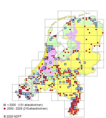 Het aantal atlasblokken (5x5 km) waarin de soort is gemeld binnen een periode van vijf jaar (vanaf 1980) of twintig jaar. Niet gecorrigeerd voor waarnemersinspanning en het aantal doorgegeven waarnemingen kan sterk variëren per periode, dus een trend in verspreiding kan hier niet direct uit worden afgelezen. Het opgegeven jaartal is het eerste jaar van de periode. Bron: gevalideerde waarnemingen uit de NDFF.