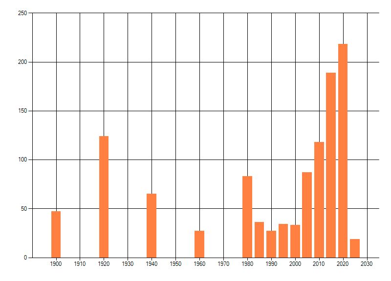 Het aantal atlasblokken (5x5 km) waarin de soort is gemeld binnen een periode van vijf jaar (vanaf 1980) of twintig jaar. Niet gecorrigeerd voor waarnemersinspanning en het aantal doorgegeven waarnemingen kan sterk variëren per periode, dus een trend in verspreiding kan hier niet direct uit worden afgelezen. Het opgegeven jaartal is het eerste jaar van de periode. Bron: gevalideerde waarnemingen uit de NDFF.