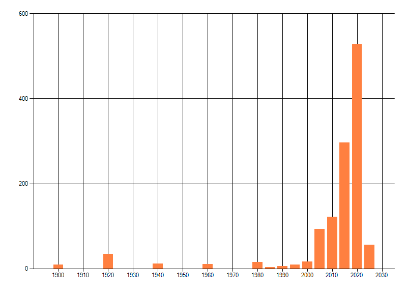 Het aantal atlasblokken (5x5 km) waarin de soort is gemeld binnen een periode van vijf jaar (vanaf 1980) of twintig jaar. Niet gecorrigeerd voor waarnemersinspanning en het aantal doorgegeven waarnemingen kan sterk variƫren per periode, dus een trend in verspreiding kan hier niet direct uit worden afgelezen. Het opgegeven jaartal is het eerste jaar van de periode. Bron: gevalideerde waarnemingen uit de NDFF.
