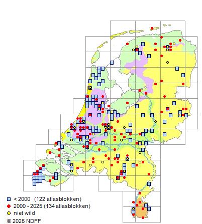 Het aantal atlasblokken (5x5 km) waarin de soort is gemeld binnen een periode van vijf jaar (vanaf 1980) of twintig jaar. Niet gecorrigeerd voor waarnemersinspanning en het aantal doorgegeven waarnemingen kan sterk variëren per periode, dus een trend in verspreiding kan hier niet direct uit worden afgelezen. Het opgegeven jaartal is het eerste jaar van de periode. Bron: gevalideerde waarnemingen uit de NDFF.