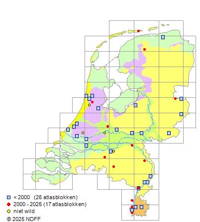 Het aantal atlasblokken (5x5 km) waarin de soort is gemeld binnen een periode van vijf jaar (vanaf 1980) of twintig jaar. Niet gecorrigeerd voor waarnemersinspanning en het aantal doorgegeven waarnemingen kan sterk variëren per periode, dus een trend in verspreiding kan hier niet direct uit worden afgelezen. Het opgegeven jaartal is het eerste jaar van de periode. Bron: gevalideerde waarnemingen uit de NDFF.
