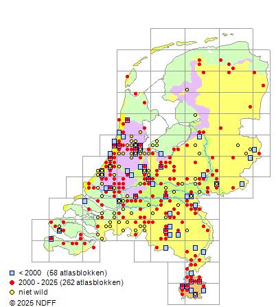 Het aantal atlasblokken (5x5 km) waarin de soort is gemeld binnen een periode van vijf jaar (vanaf 1980) of twintig jaar. Niet gecorrigeerd voor waarnemersinspanning en het aantal doorgegeven waarnemingen kan sterk variëren per periode, dus een trend in verspreiding kan hier niet direct uit worden afgelezen. Het opgegeven jaartal is het eerste jaar van de periode. Bron: gevalideerde waarnemingen uit de NDFF.
