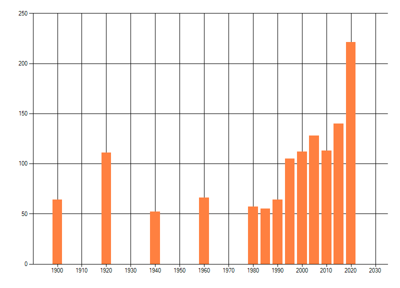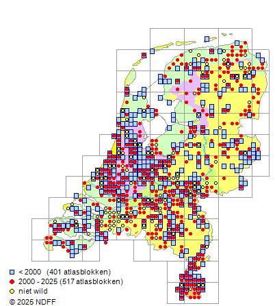 Het aantal atlasblokken (5x5 km) waarin de soort is gemeld binnen een periode van vijf jaar (vanaf 1980) of twintig jaar. Niet gecorrigeerd voor waarnemersinspanning en het aantal doorgegeven waarnemingen kan sterk variëren per periode, dus een trend in verspreiding kan hier niet direct uit worden afgelezen. Het opgegeven jaartal is het eerste jaar van de periode. Bron: gevalideerde waarnemingen uit de NDFF.