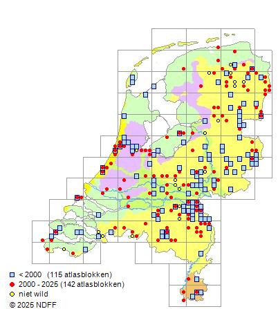 Het aantal atlasblokken (5x5 km) waarin de soort is gemeld binnen een periode van vijf jaar (vanaf 1980) of twintig jaar. Niet gecorrigeerd voor waarnemersinspanning en het aantal doorgegeven waarnemingen kan sterk variëren per periode, dus een trend in verspreiding kan hier niet direct uit worden afgelezen. Het opgegeven jaartal is het eerste jaar van de periode. Bron: gevalideerde waarnemingen uit de NDFF.