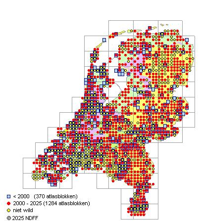 Het aantal atlasblokken (5x5 km) waarin de soort is gemeld binnen een periode van vijf jaar (vanaf 1980) of twintig jaar. Niet gecorrigeerd voor waarnemersinspanning en het aantal doorgegeven waarnemingen kan sterk variëren per periode, dus een trend in verspreiding kan hier niet direct uit worden afgelezen. Het opgegeven jaartal is het eerste jaar van de periode. Bron: gevalideerde waarnemingen uit de NDFF.