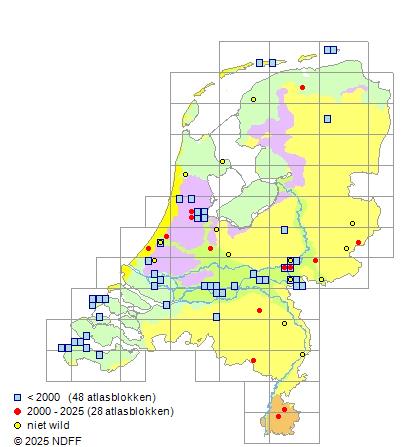 Het aantal atlasblokken (5x5 km) waarin de soort is gemeld binnen een periode van vijf jaar (vanaf 1980) of twintig jaar. Niet gecorrigeerd voor waarnemersinspanning en het aantal doorgegeven waarnemingen kan sterk variëren per periode, dus een trend in verspreiding kan hier niet direct uit worden afgelezen. Het opgegeven jaartal is het eerste jaar van de periode. Bron: gevalideerde waarnemingen uit de NDFF.