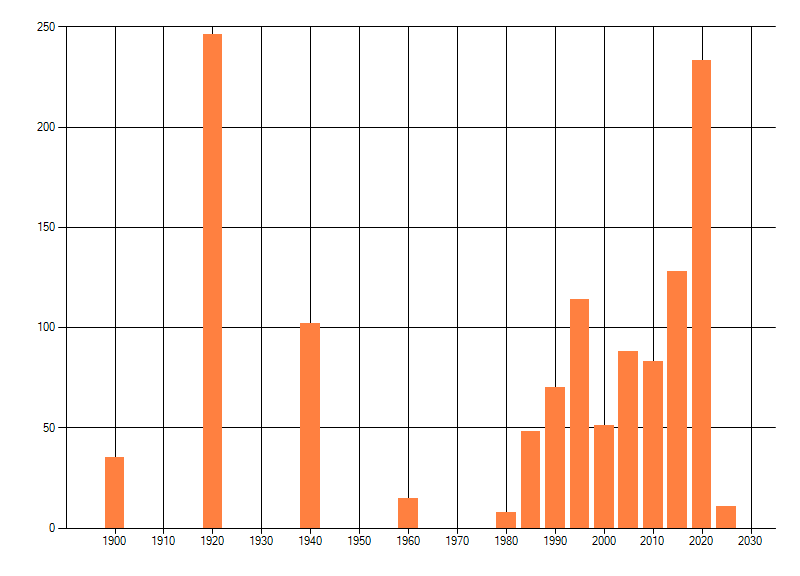 Het aantal atlasblokken (5x5 km) waarin de soort is gemeld binnen een periode van vijf jaar (vanaf 1980) of twintig jaar. Niet gecorrigeerd voor waarnemersinspanning en het aantal doorgegeven waarnemingen kan sterk variëren per periode, dus een trend in verspreiding kan hier niet direct uit worden afgelezen. Het opgegeven jaartal is het eerste jaar van de periode. Bron: gevalideerde waarnemingen uit de NDFF.