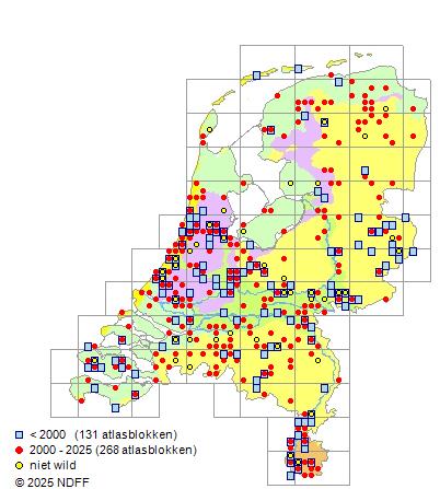 Het aantal atlasblokken (5x5 km) waarin de soort is gemeld binnen een periode van vijf jaar (vanaf 1980) of twintig jaar. Niet gecorrigeerd voor waarnemersinspanning en het aantal doorgegeven waarnemingen kan sterk variëren per periode, dus een trend in verspreiding kan hier niet direct uit worden afgelezen. Het opgegeven jaartal is het eerste jaar van de periode. Bron: gevalideerde waarnemingen uit de NDFF.