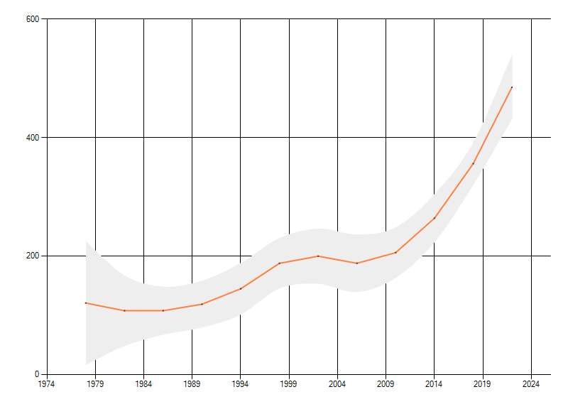 Gemiddelde trend van het aantal kilometerhokken waarin de soort voorkomt, weergegeven als indexcijfer (1975-1978 = 100). De trend is gecorrigeerd voor waarnemersinspanning en geeft de relatieve verandering in het aantal bezette kilometerhokken weer. Voor de berekening worden de data per periode van vier jaar samengenomen. In de grafiek correspondeert ieder punt met het laatste jaar van zo'n periode.
