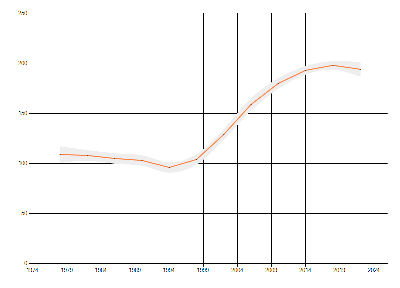 Gemiddelde trend van het aantal kilometerhokken waarin de soort voorkomt, weergegeven als indexcijfer (1975-1978 = 100). De trend is gecorrigeerd voor waarnemersinspanning en geeft de relatieve verandering in het aantal bezette kilometerhokken weer. Voor de berekening worden de data per periode van vier jaar samengenomen. In de grafiek correspondeert ieder punt met het laatste jaar van zo'n periode.