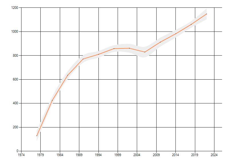 In de grafiek correspondeert ieder punt met het laatste jaar van zo'n periode.