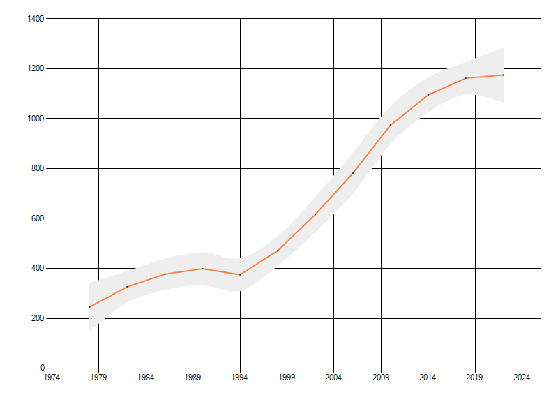 Gemiddelde trend van het aantal kilometerhokken waarin de soort voorkomt, weergegeven als indexcijfer (1975-1978 = 100). De trend is gecorrigeerd voor waarnemersinspanning en geeft de relatieve verandering in het aantal bezette kilometerhokken weer. Voor de berekening worden de data per periode van vier jaar samengenomen. In de grafiek correspondeert ieder punt met het laatste jaar van zo'n periode.