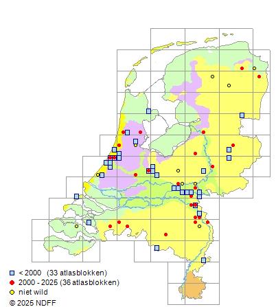Het aantal atlasblokken (5x5 km) waarin de soort is gemeld binnen een periode van vijf jaar (vanaf 1980) of twintig jaar. Niet gecorrigeerd voor waarnemersinspanning en het aantal doorgegeven waarnemingen kan sterk variëren per periode, dus een trend in verspreiding kan hier niet direct uit worden afgelezen. Het opgegeven jaartal is het eerste jaar van de periode. Bron: gevalideerde waarnemingen uit de NDFF.