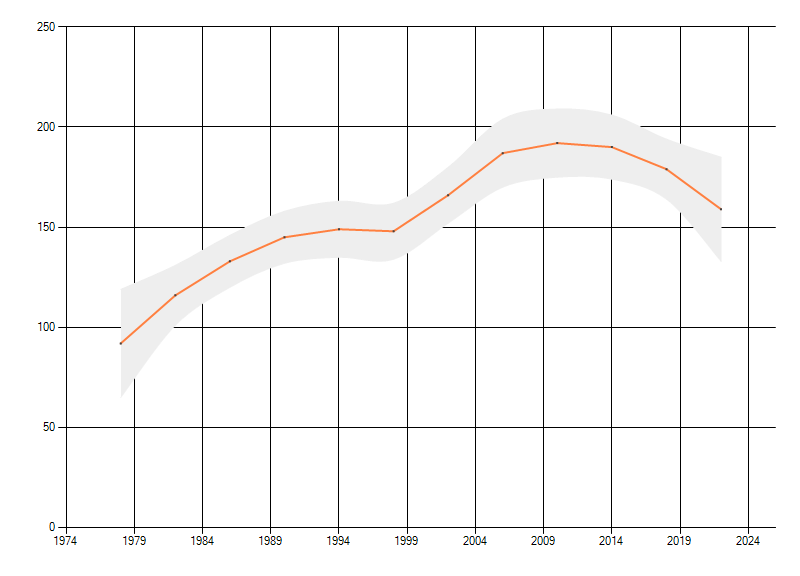 Gemiddelde trend van het aantal kilometerhokken waarin de soort voorkomt, weergegeven als indexcijfer (1975-1978 = 100).