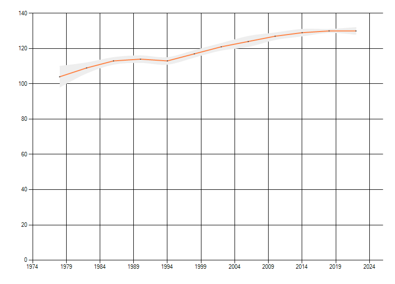 Gemiddelde trend van het aantal kilometerhokken waarin de soort voorkomt, weergegeven als indexcijfer (1975-1978 = 100). De trend is gecorrigeerd voor waarnemersinspanning en geeft de relatieve verandering in het aantal bezette kilometerhokken weer. Voor de berekening worden de data per periode van vier jaar samengenomen. In de grafiek correspondeert ieder punt met het laatste jaar van zo'n periode.