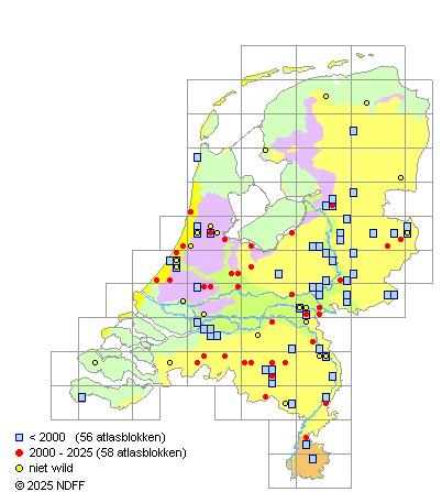 Het aantal atlasblokken (5x5 km) waarin de soort is gemeld binnen een periode van vijf jaar (vanaf 1980) of twintig jaar. Niet gecorrigeerd voor waarnemersinspanning en het aantal doorgegeven waarnemingen kan sterk variëren per periode, dus een trend in verspreiding kan hier niet direct uit worden afgelezen. Het opgegeven jaartal is het eerste jaar van de periode. Bron: gevalideerde waarnemingen uit de NDFF.