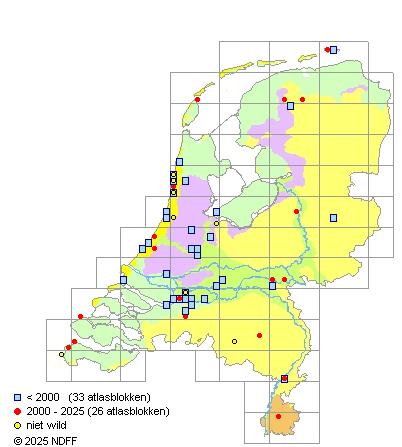 Het aantal atlasblokken (5x5 km) waarin de soort is gemeld binnen een periode van vijf jaar (vanaf 1980) of twintig jaar. Niet gecorrigeerd voor waarnemersinspanning en het aantal doorgegeven waarnemingen kan sterk variëren per periode, dus een trend in verspreiding kan hier niet direct uit worden afgelezen. Het opgegeven jaartal is het eerste jaar van de periode. Bron: gevalideerde waarnemingen uit de NDFF.