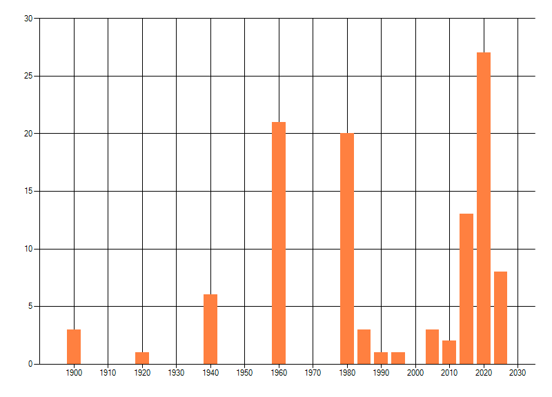 Het aantal atlasblokken (5x5 km) waarin de soort is gemeld binnen een periode van vijf jaar (vanaf 1980) of twintig jaar. Niet gecorrigeerd voor waarnemersinspanning en het aantal doorgegeven waarnemingen kan sterk variëren per periode, dus een trend in verspreiding kan hier niet direct uit worden afgelezen. Het opgegeven jaartal is het eerste jaar van de periode. Bron: gevalideerde waarnemingen uit de NDFF.