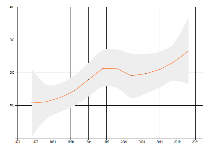 Gemiddelde trend van het aantal kilometerhokken waarin de soort voorkomt, weergegeven als indexcijfer (1975-1978 = 100). De trend is gecorrigeerd voor waarnemersinspanning en geeft de relatieve verandering in het aantal bezette kilometerhokken weer. Voor de berekening worden de data per periode van vier jaar samengenomen. In de grafiek correspondeert ieder punt met het laatste jaar van zo'n periode.