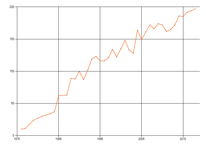 In de grafiek correspondeert ieder punt met het laatste jaar van zo'n periode.