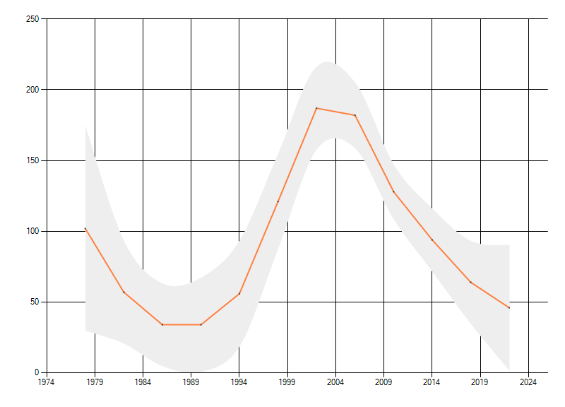 Gemiddelde trend van het aantal kilometerhokken waarin de soort voorkomt, weergegeven als indexcijfer (1975-1978 = 100). De trend is gecorrigeerd voor waarnemersinspanning en geeft de relatieve verandering in het aantal bezette kilometerhokken weer. Voor de berekening worden de data per periode van vier jaar samengenomen. In de grafiek correspondeert ieder punt met het laatste jaar van zo'n periode.