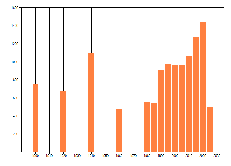 Het aantal atlasblokken (5x5 km) waarin de soort is gemeld binnen een periode van vijf jaar (vanaf 1980) of twintig jaar. Niet gecorrigeerd voor waarnemersinspanning en het aantal doorgegeven waarnemingen kan sterk variëren per periode, dus een trend in verspreiding kan hier niet direct uit worden afgelezen. Het opgegeven jaartal is het eerste jaar van de periode. Bron: gevalideerde waarnemingen uit de NDFF.