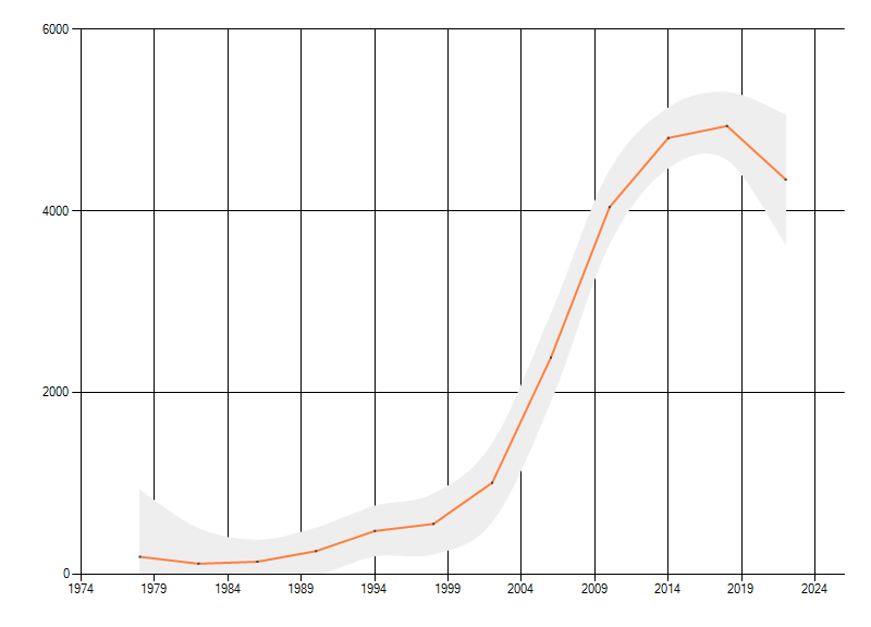 Gemiddelde trend van het aantal kilometerhokken waarin de soort voorkomt, weergegeven als indexcijfer (1975-1978 = 100). De trend is gecorrigeerd voor waarnemersinspanning en geeft de relatieve verandering in het aantal bezette kilometerhokken weer. Voor de berekening worden de data per periode van vier jaar samengenomen. In de grafiek correspondeert ieder punt met het laatste jaar van zo'n periode.