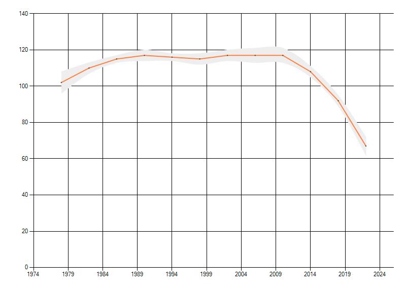 Gemiddelde trend van het aantal kilometerhokken waarin de soort voorkomt, weergegeven als indexcijfer (1975-1978 = 100).