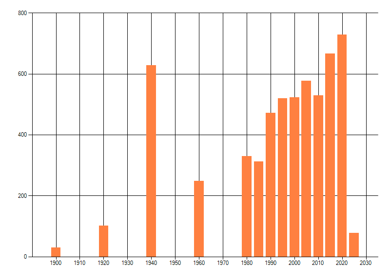 Het aantal atlasblokken (5x5 km) waarin de soort is gemeld binnen een periode van vijf jaar (vanaf 1980) of twintig jaar. Niet gecorrigeerd voor waarnemersinspanning en het aantal doorgegeven waarnemingen kan sterk variëren per periode, dus een trend in verspreiding kan hier niet direct uit worden afgelezen. Het opgegeven jaartal is het eerste jaar van de periode. Bron: gevalideerde waarnemingen uit de NDFF.