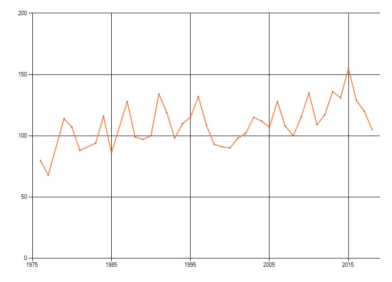 Gemiddelde trend van het aantal kilometerhokken waarin de soort voorkomt, weergegeven als indexcijfer (1975-1978 = 100). De trend is gecorrigeerd voor waarnemersinspanning en geeft de relatieve verandering in het aantal bezette kilometerhokken weer. Voor de berekening worden de data per periode van vier jaar samengenomen. In de grafiek correspondeert ieder punt met het laatste jaar van zo'n periode.